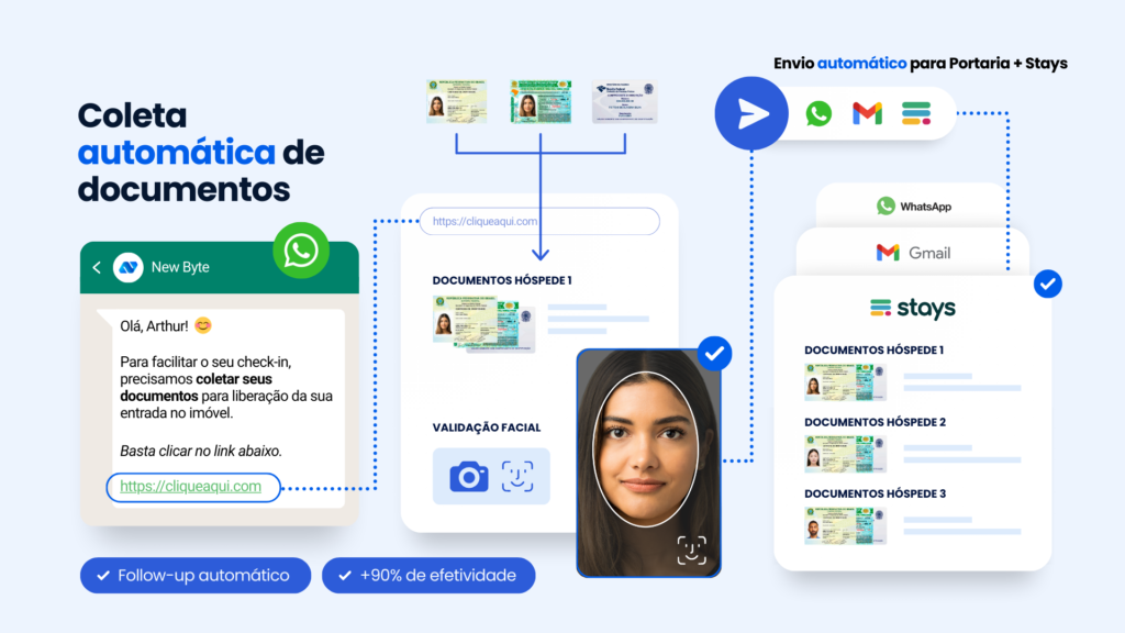 O NCheck tem outras funcionalidades que fazem a diferença na rotina do anfitrião profissional. Com essa solução da New Byte, você pode criar lembretes automáticos de check-in, garantindo que seus hóspedes façam a validação da documentação. Também pode criar outras automações com prazo de, por exemplo, um, dois ou três dias antes do check-in, para reduzir atrasos e evitar bloqueios na portaria, facilitando todo o fluxo de chegada ao imóvel.